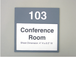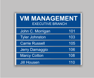 Framed laser engraved office signs provide a traditional look with the ability to change the names.This type sign is very popular in government and military offices. The top portion of the sign is fixed (with or without ADA compliant braille) while the bottom portion can be changed as needed. The signs come in popluar colors such as gray, brown, blue, black and white. Frames are available in different colors such as gray, brown, almond, black and white, The raised letters come in white or black. Standard production time is 15 business days.